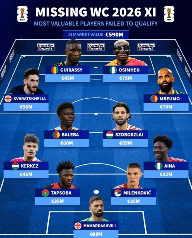 北京时间11月19日,周德盘点了确认无缘美国、加拿大、墨西哥世界杯的11支最贵阵容。格鲁吉亚球星库瓦拉·茨赫里亚以 9000 万欧元的身价位居榜首。匈牙利的索博斯莱、尼日利亚的奥西姆亨、喀麦隆的姆贝莫和几内亚的吉拉奇也在名单上。据德国转会统计,无法参加2026年世界杯的11名身价最高的球员阵容已经确定:门将马马达什维利(格鲁吉亚)2800万欧元,后卫艾娜(尼日尔利亚)2200万欧元,米伦科维奇(塞尔维亚)3500万欧元,塔普索瓦(布基纳法索)3500万欧元,凯尔·凯兹(匈牙利)4500万欧元,中场球员索博斯莱(匈牙利)8500万欧元、巴勒瓦(喀麦隆)6000万欧元、前锋姆贝莫(喀麦隆)7000万欧元、奥西姆亨(尼日利亚)7500万欧元、吉拉西(几内亚)4500万欧元、克瓦拉什里亚(格鲁吉亚)9000万欧元总计:5.9亿欧元其他前10名球员确认缺席世界杯奖金: 1. 卢克曼(尼日利亚) 4000万欧元 2. 扬库巴·敏特尔(冈比亚) 3500万欧元 3. 丹戈·瓦塔拉(布基纳法索) 3500万欧元 4. 弗拉霍维奇(塞尔维亚) 3500万欧元 5. 帕夫利迪斯(希腊) 3500万欧元 6. 佐里斯(希腊) 30万欧元7.米卡尔塔泽(格鲁吉亚) 3000万欧元 8. 巴西(尼日利亚) 2800万欧元 9. 彼得罗维奇(塞尔维亚) 2800万欧元 10. 伊沃比(尼日利亚) 2800万欧元 [在MIG上独家观看英超联赛]