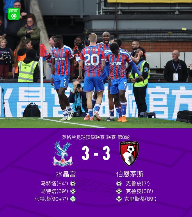 北京时间10月18日,英格兰足球甲级联赛第8轮,水晶宫主场迎战伯恩茅斯。水晶宫球员马塔上演帽子戏法。伯恩茅斯的克鲁皮打进两球,克里斯蒂打进一球。最终比分是水晶宫3-3伯恩茅斯。关键比赛第7分钟,克鲁皮头球取得领先。伯恩茅斯1-0获胜。第38分钟,克鲁皮补射破门,完成双环。第64分钟,伯恩茅斯2-0水晶宫。 2-2 米格。观看英超联赛 89 分钟。塔维尼尔从最后一道线越过。克里斯蒂进球。伯恩茅斯 3-2。水晶宫咪咕。注意90分钟和7分钟。英超第38分钟,克鲁皮补射破门,再添两分。伯恩茅斯2-0水晶宫。英超第52分钟,塞内西拉倒萨尔领到黄牌。经VAR复核,确认原判。 64分钟在英超联赛中。环,水晶宫2-2英超米格独家观看第77分钟,恩凯蒂亚越位在先,进球被判无效。米格英超第89分钟,塔维尼尔最后线传中,克里斯蒂破门,伯恩茅斯3-2水晶宫 米格英超第90+7分钟,圭伊破门,马特塔主罚点球,水晶宫3-0伯恩茅斯 球队阵容技术统计【米格英超独家观点】